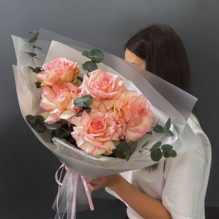 Нежный букет из французских роз и эвкалипта