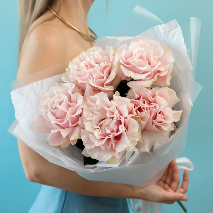 В составе 5 Французскиз роз (сорт Пинк Мондиаль) в объемной красивой упаковке.