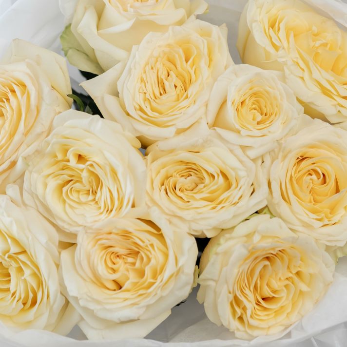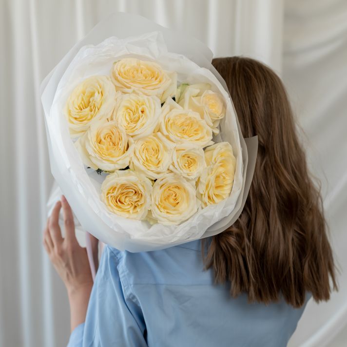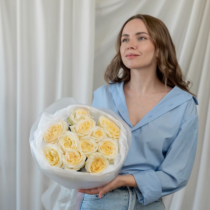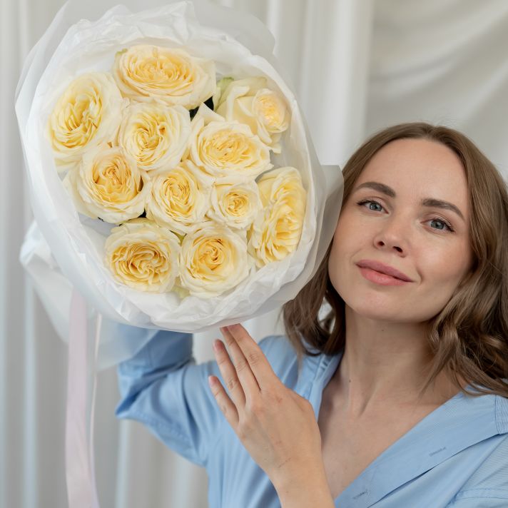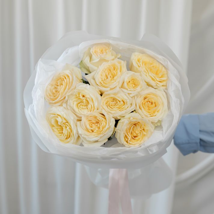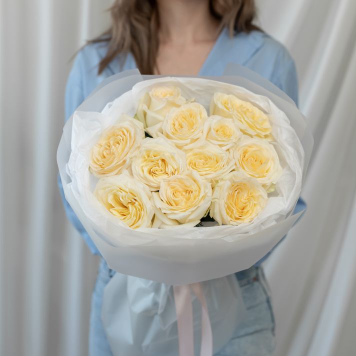 11 кремовых роз (60 см) в дизайнерской упаковке.