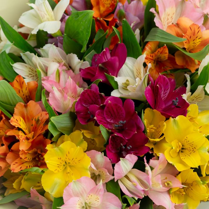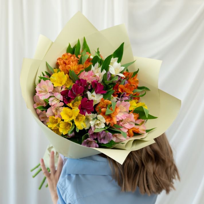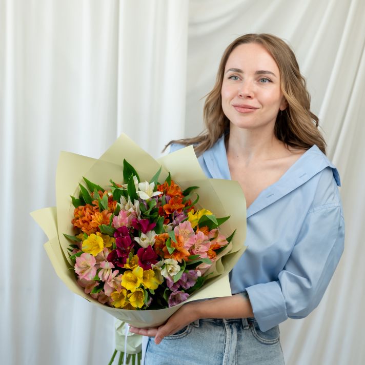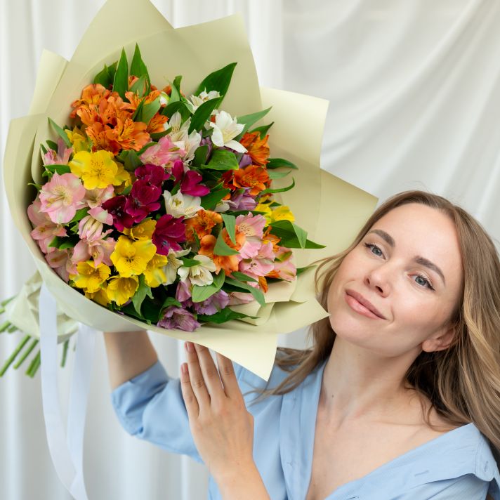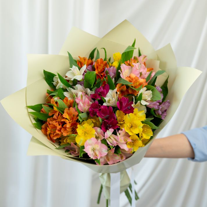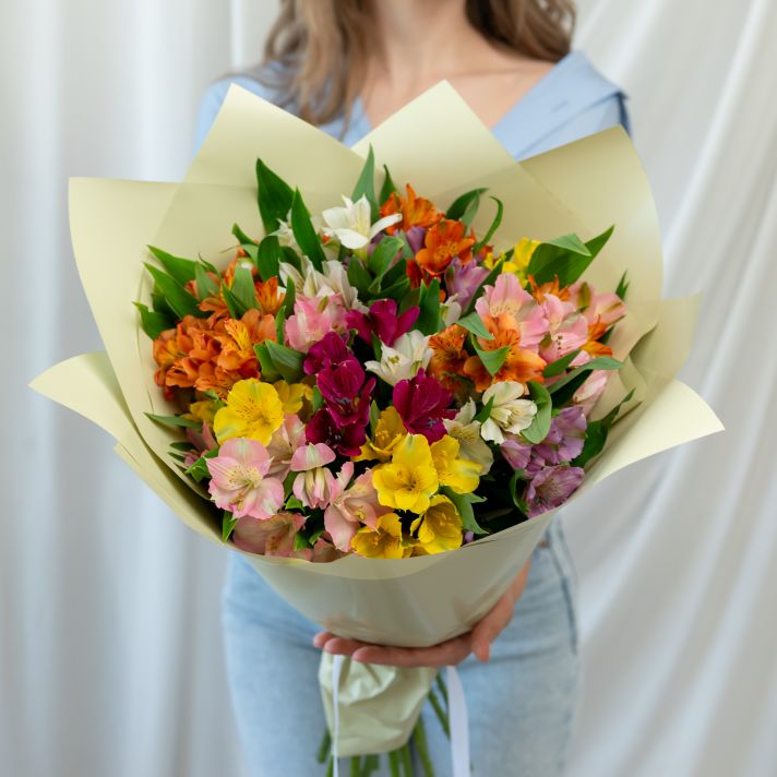 В составе 15 альстромерий микс в дизайнерской упаковке.