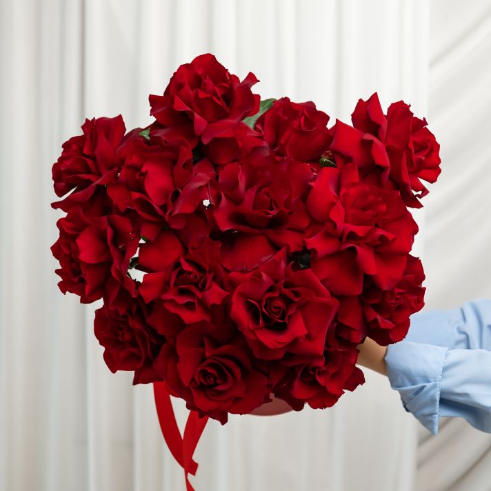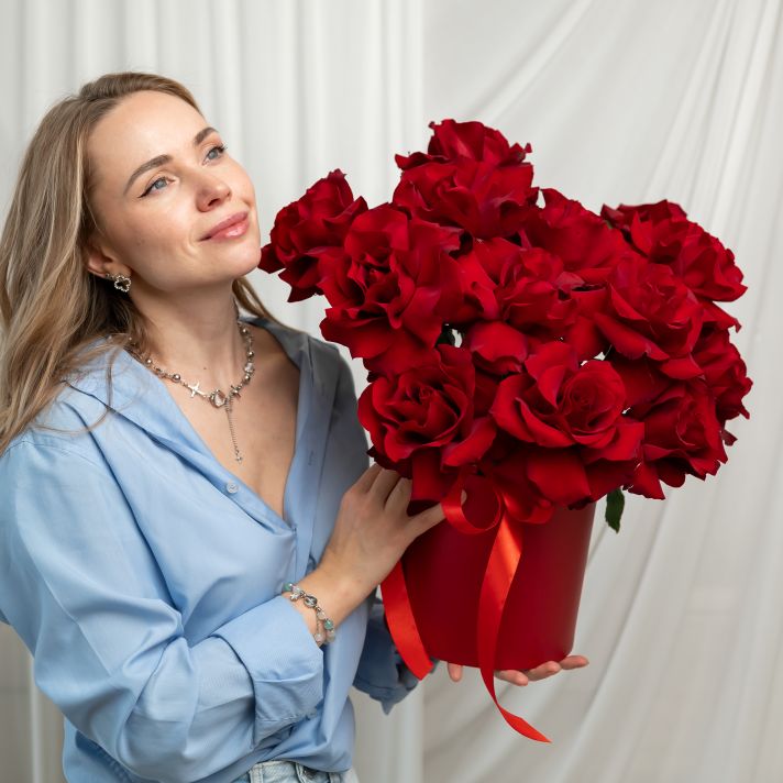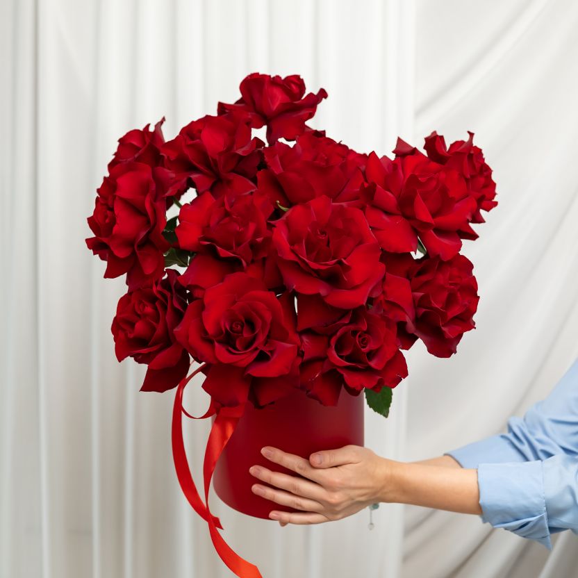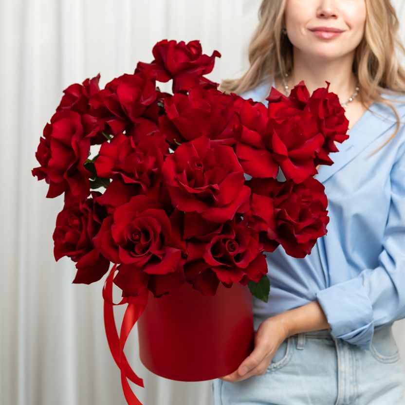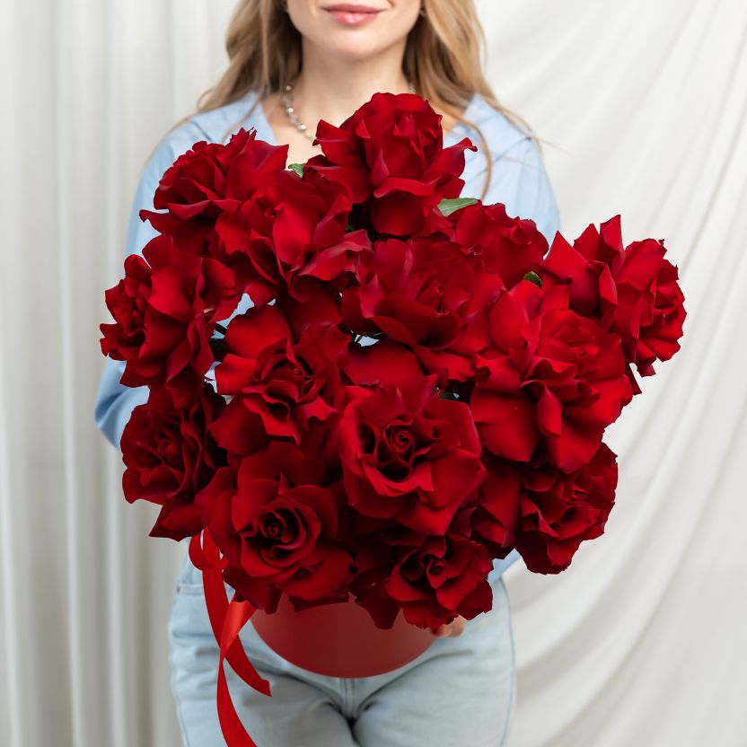 15 французских роз в шляпной коробке (сорт Эксплорер)