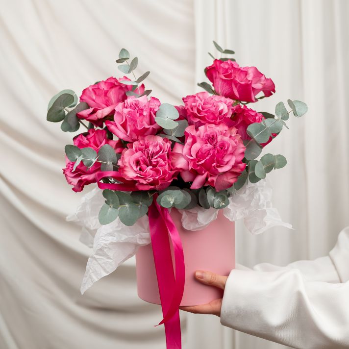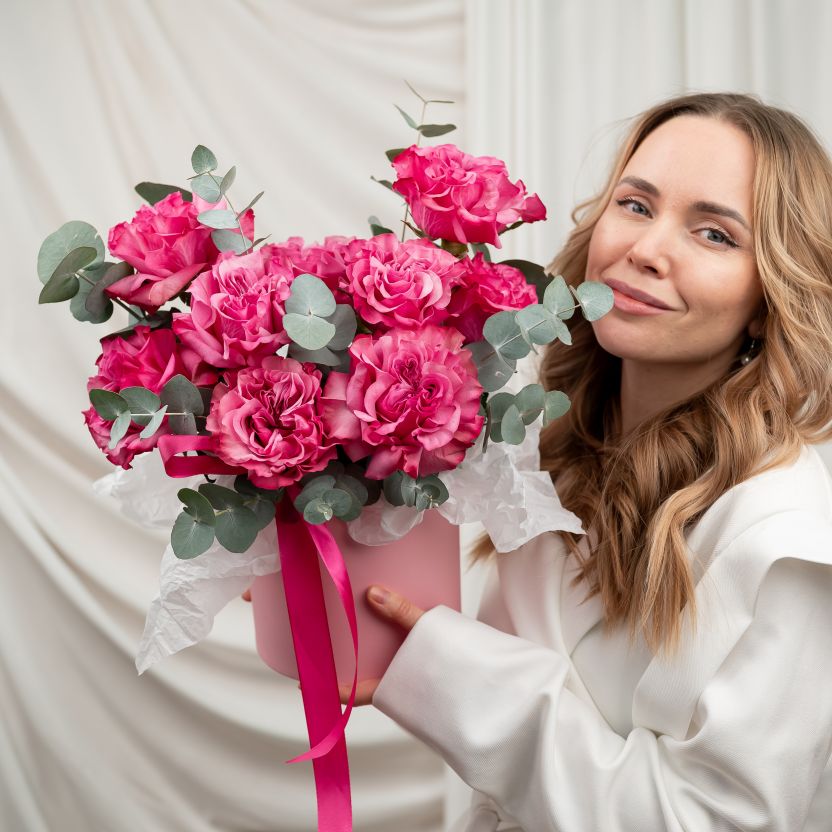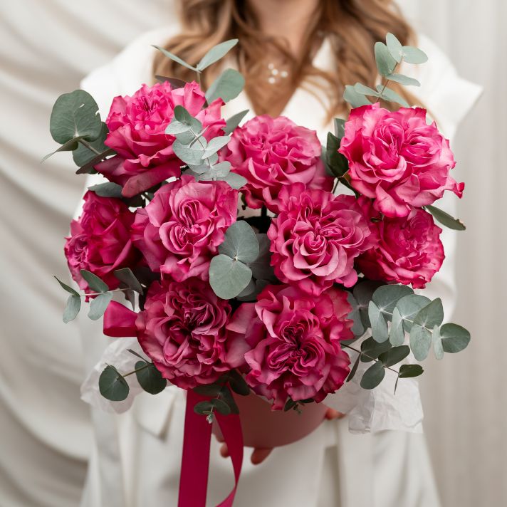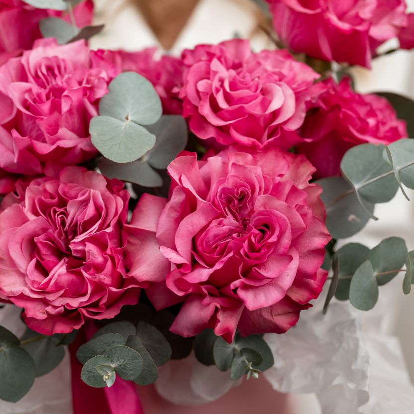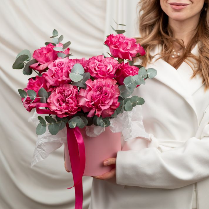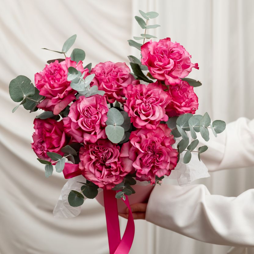 Французские розы 3шт Диантус розовый 3шт Альстромерия 2шт Эвкалипт 3шт Дизайнерская упаковка