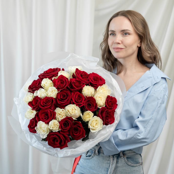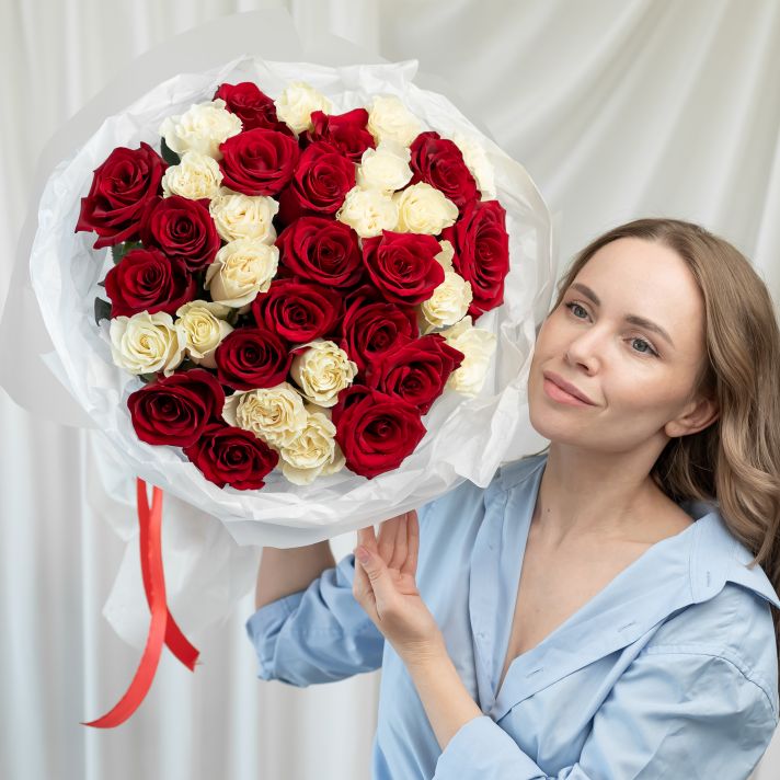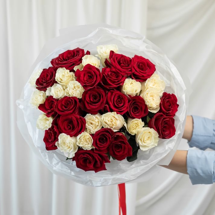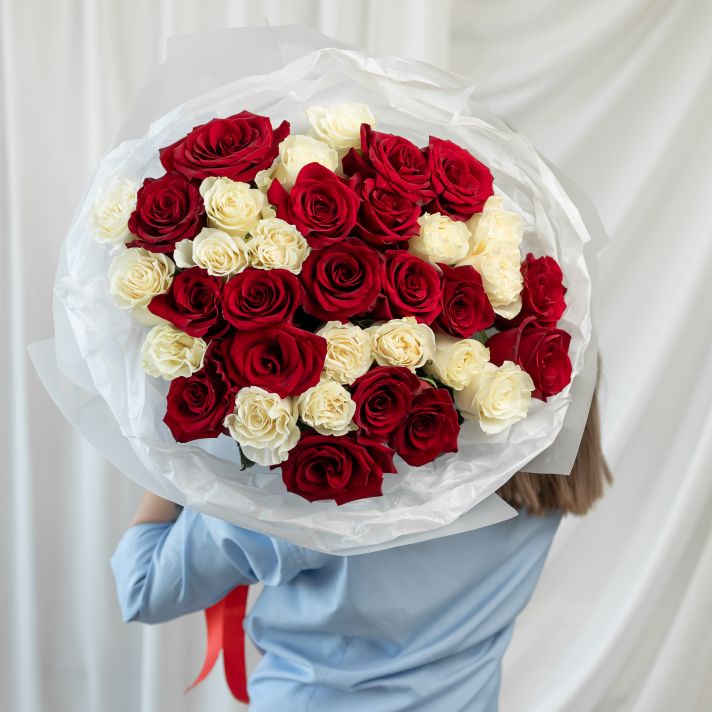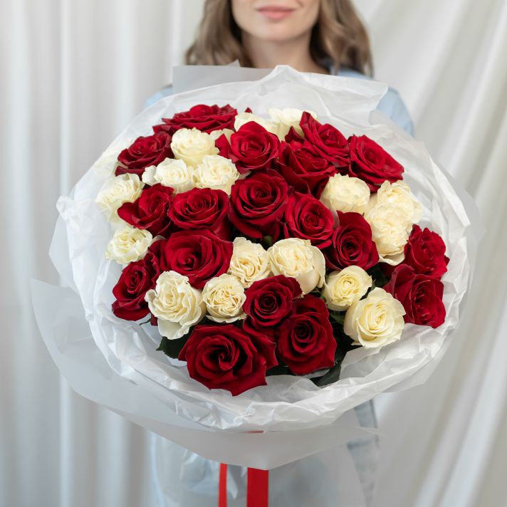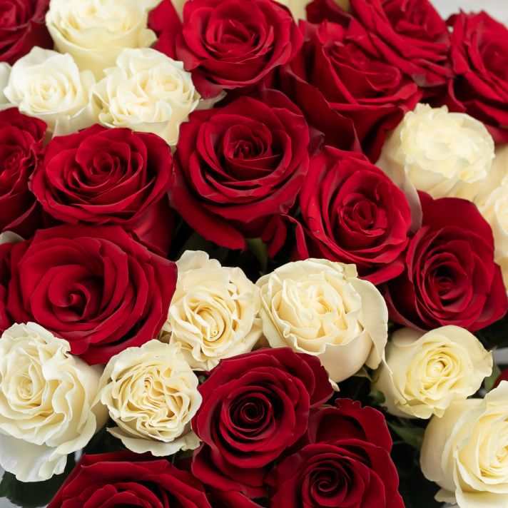 В составе красные розы (16 шт), белая роза (17 шт), шляпная коробка, флористическая губка.