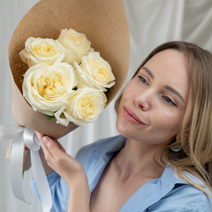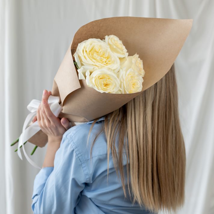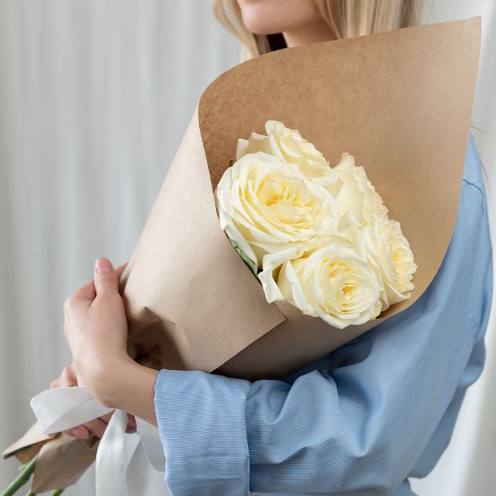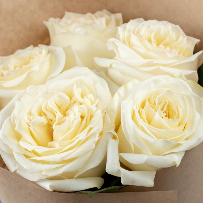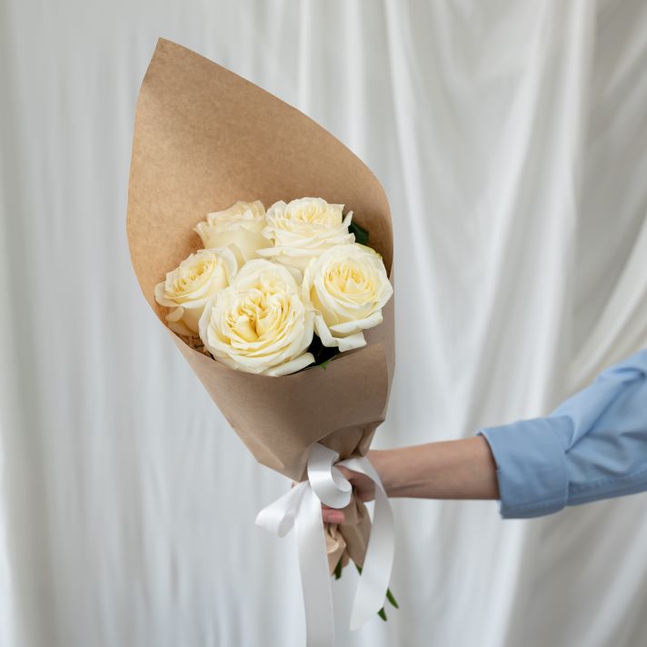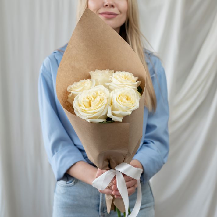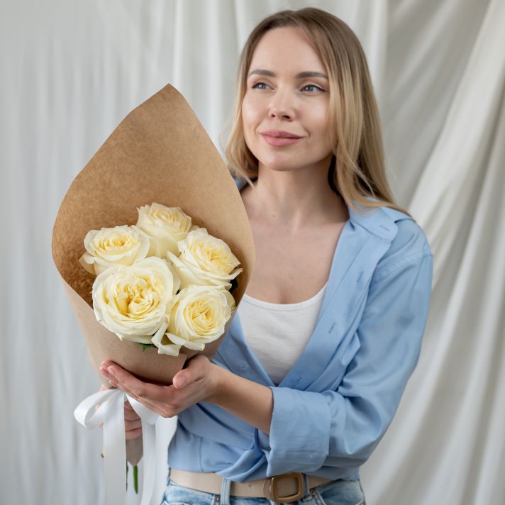 5 кремовых роз (60 см) в дизайнерской упаковке.