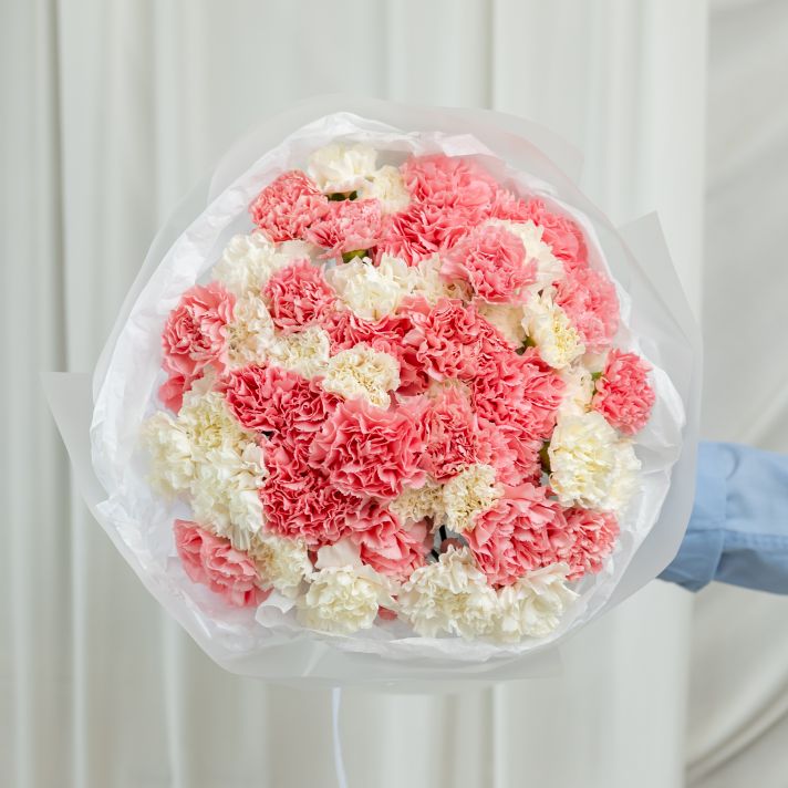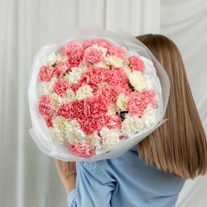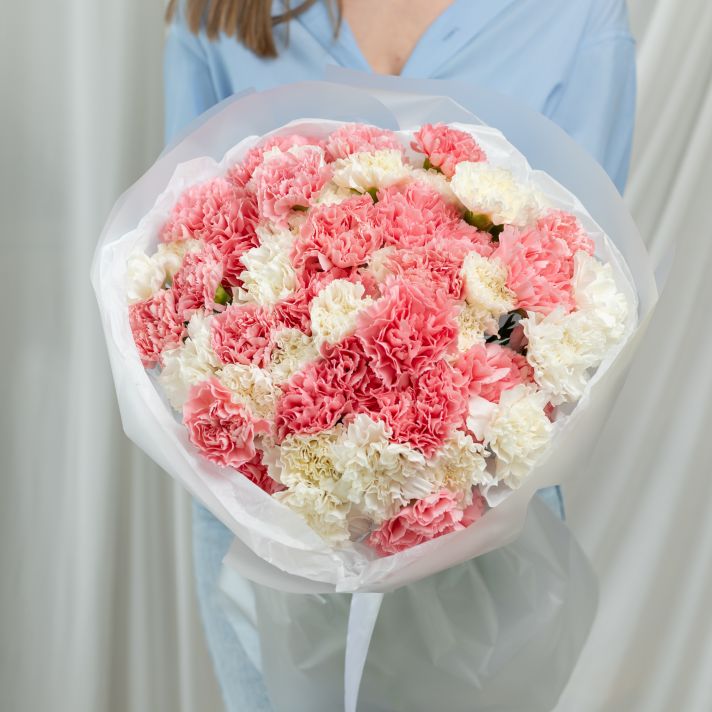 В составе 51 бело-розовых диантусов в дизайнерской упаковке.
