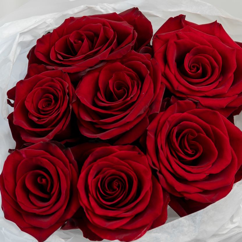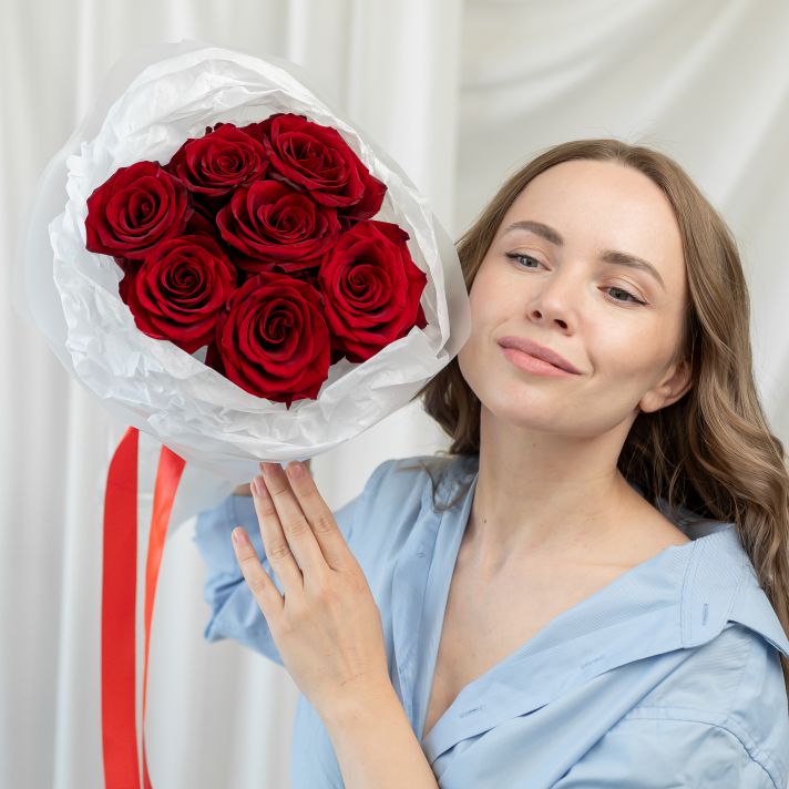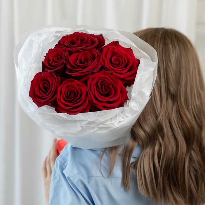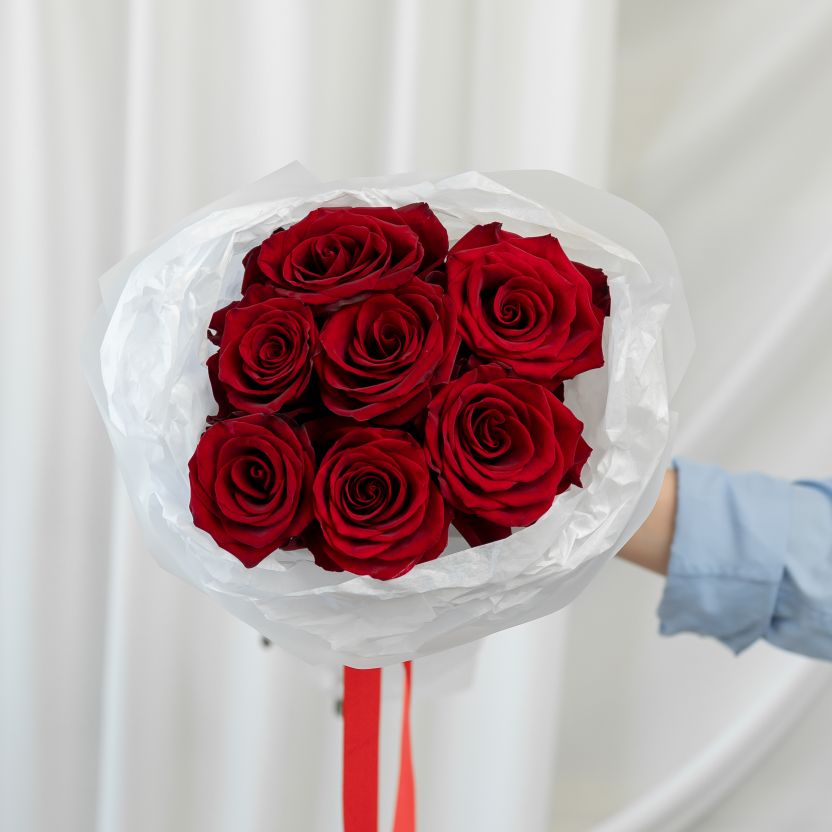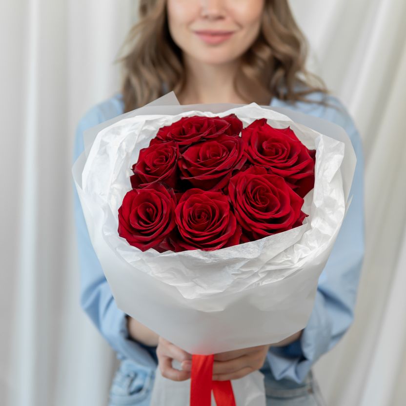 7 красных роз (Эквадор) в дизайнерской упаковке.