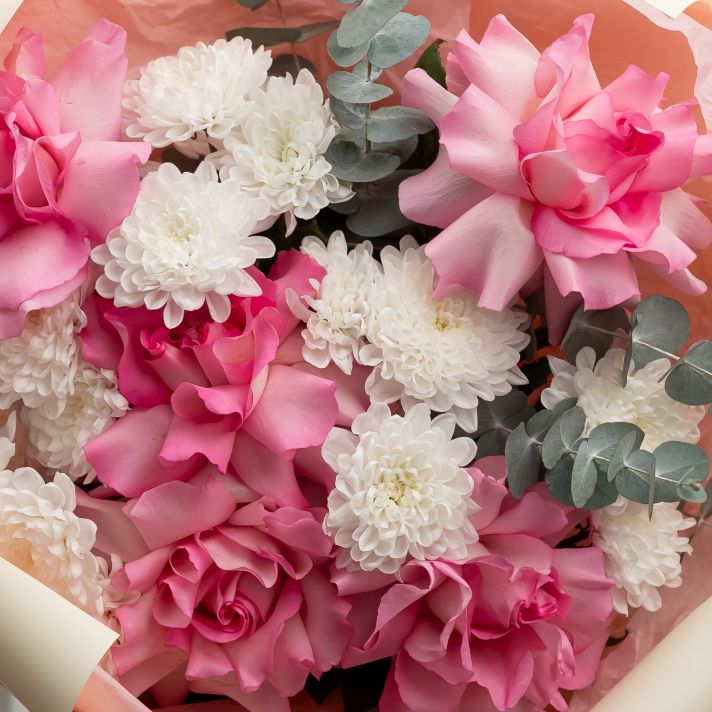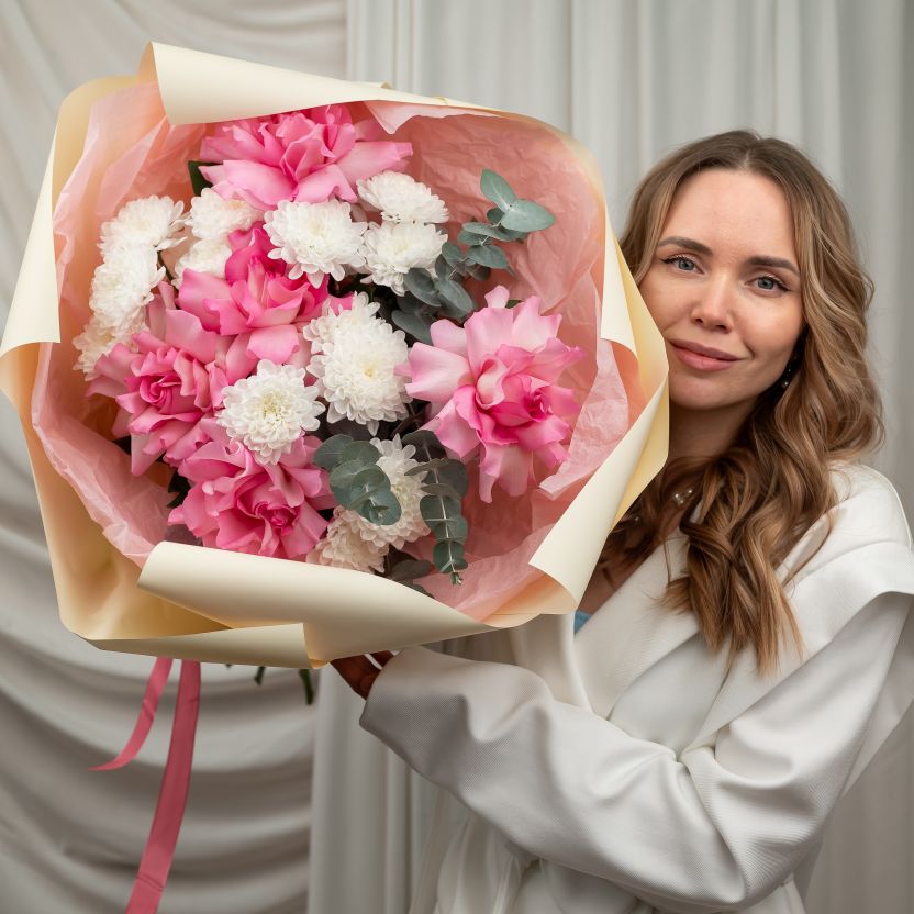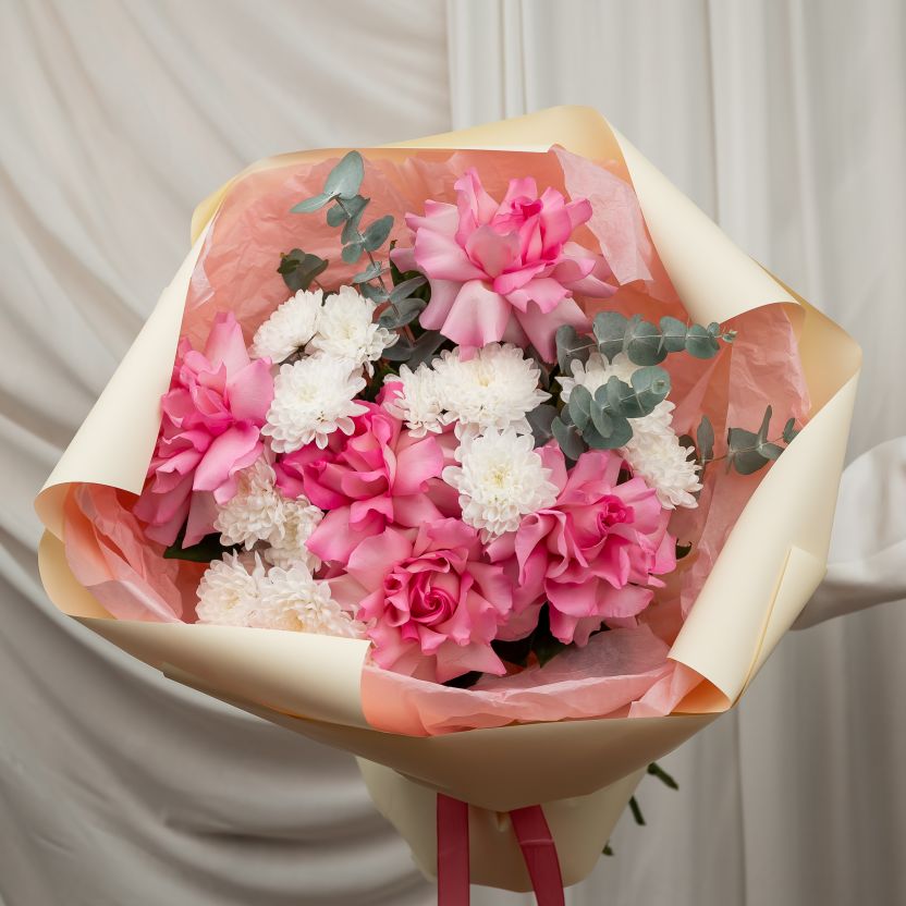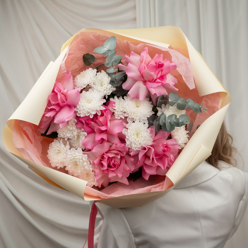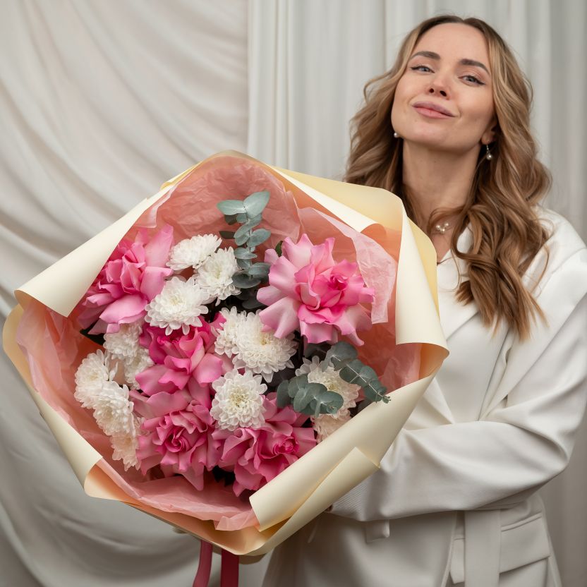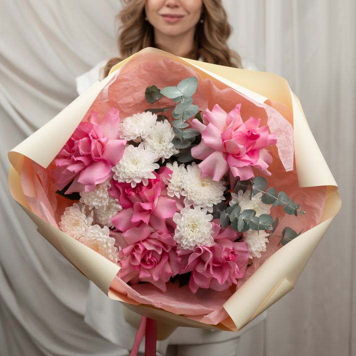 Французские розы 3шт Диантус розовый 3шт Альстромерия 2шт Эвкалипт 3шт Дизайнерская упаковка