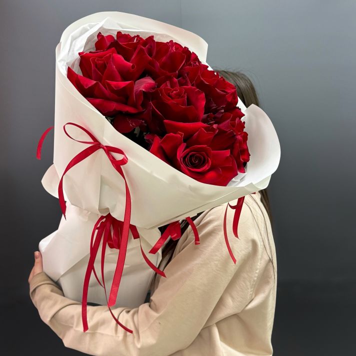51 красная роза в объемной стильной упаковке.