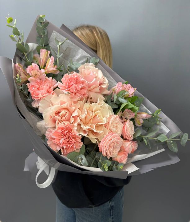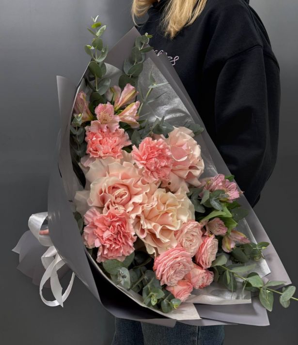 Французские розы 3шт Диантус розовый 3шт Альстромерия 2шт Эвкалипт 3шт Дизайнерская упаковка