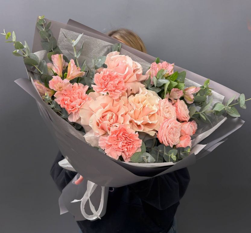 Французские розы 3шт Диантус розовый 3шт Альстромерия 2шт Эвкалипт 3шт Дизайнерская упаковка
