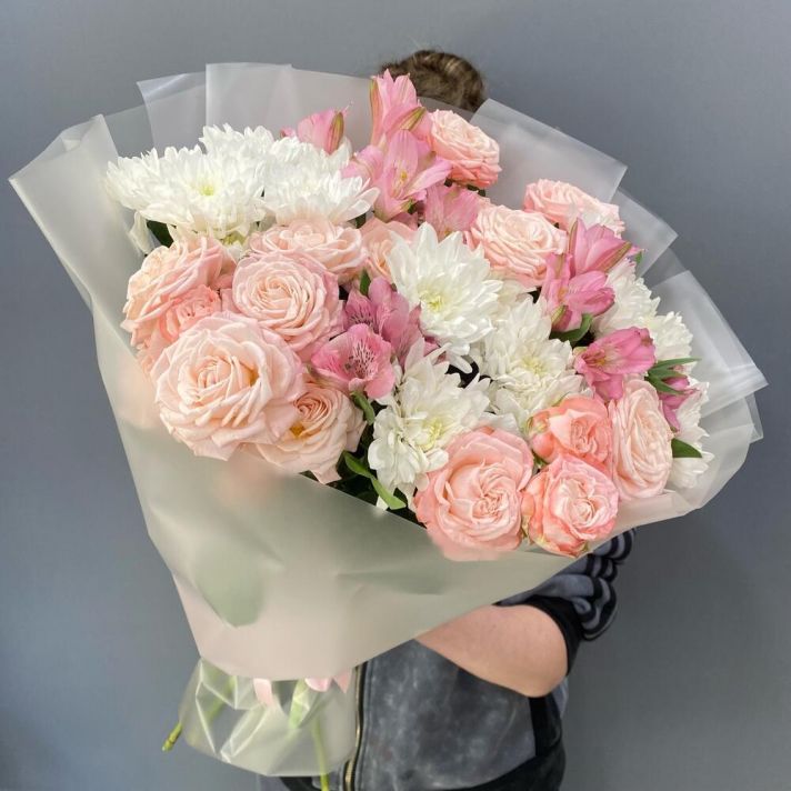 Букет авторский с кустовыми розами, хризантемой и альстромерией
