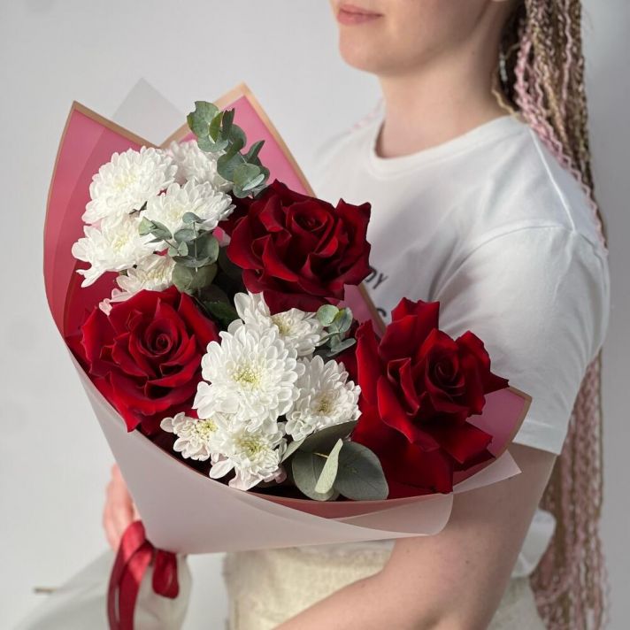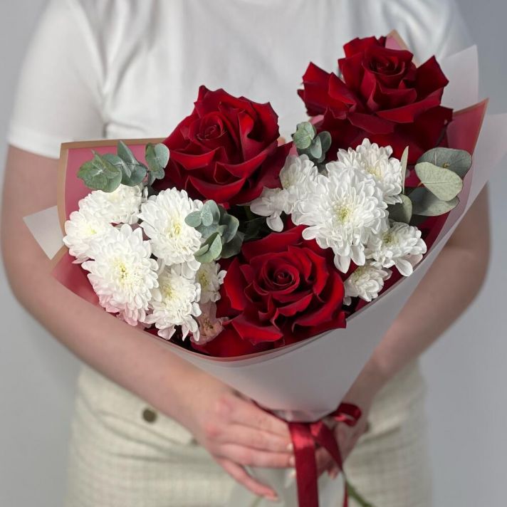 Букет из французских роз и хризантем с добавлением эвкалипта