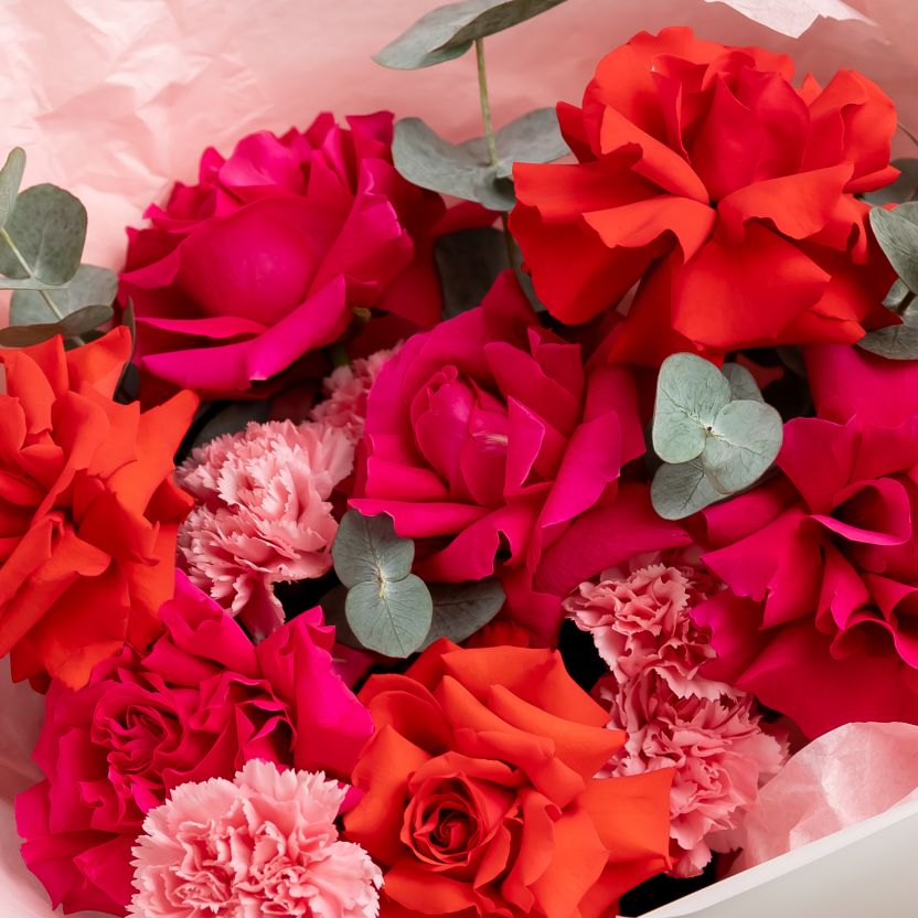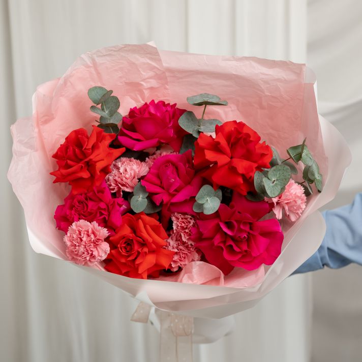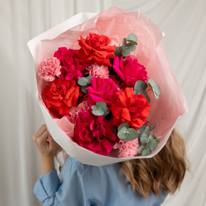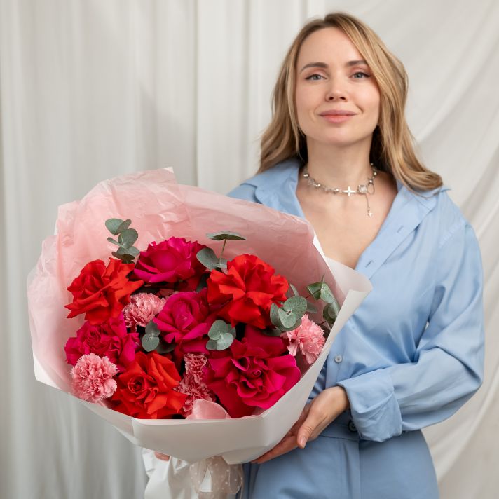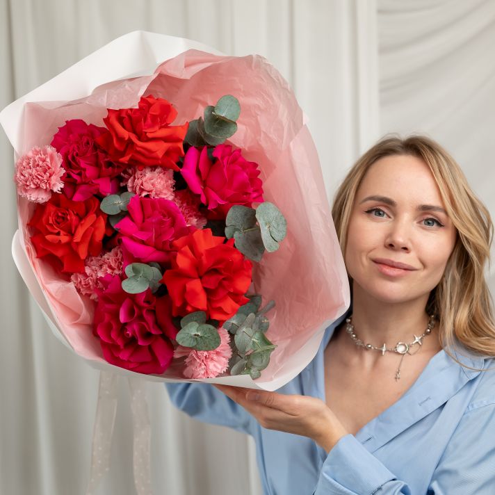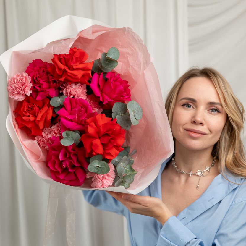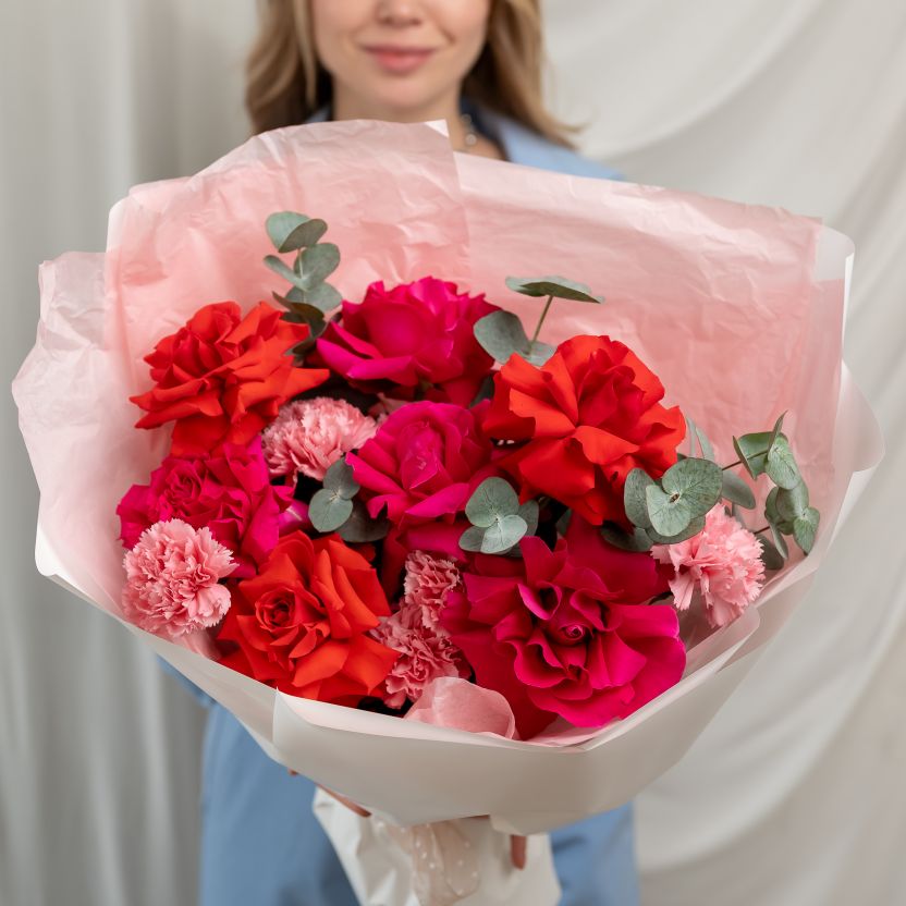 Французские розы с диантусами и эвкалиптом