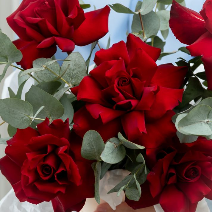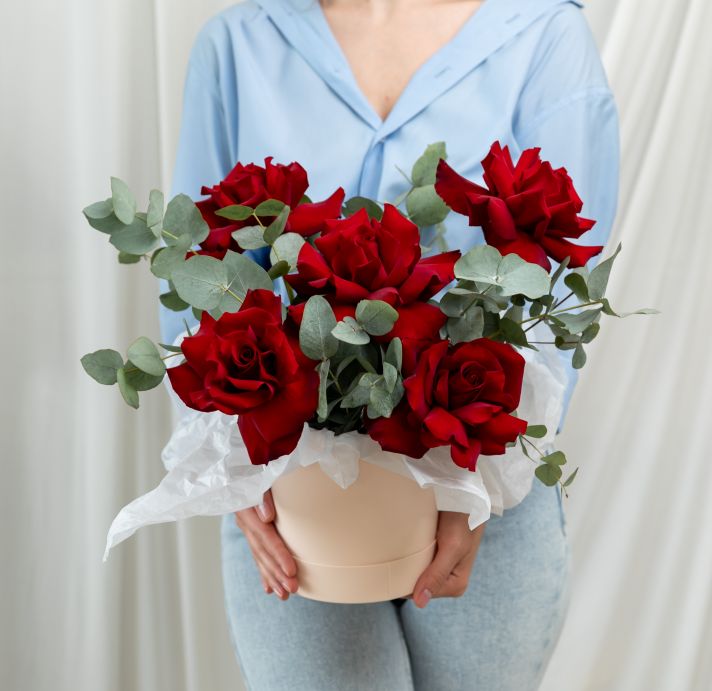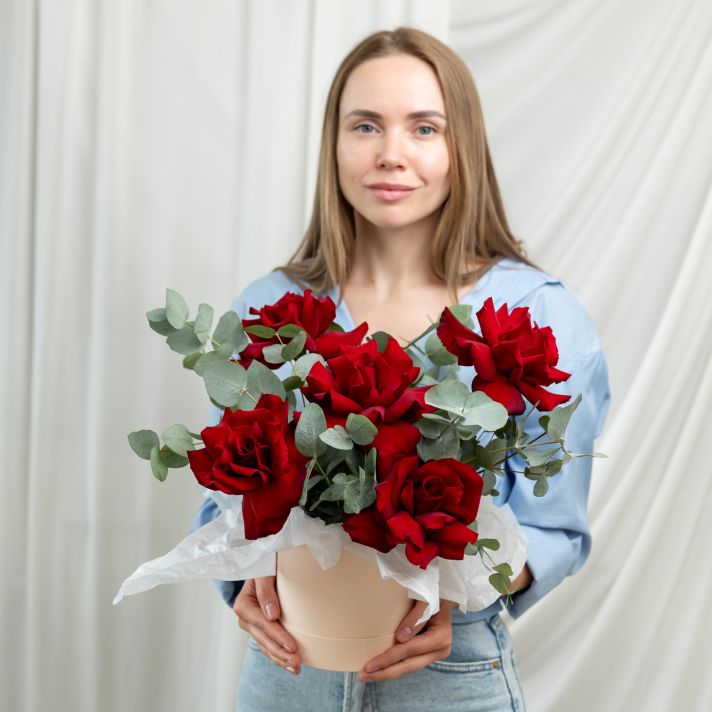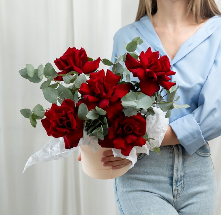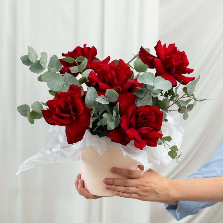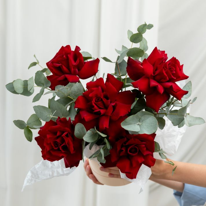 В составе 5 красных вывернутых роз (сорт Эквадор) с эвкалиптом, шляпная коробка, флористическая губка.