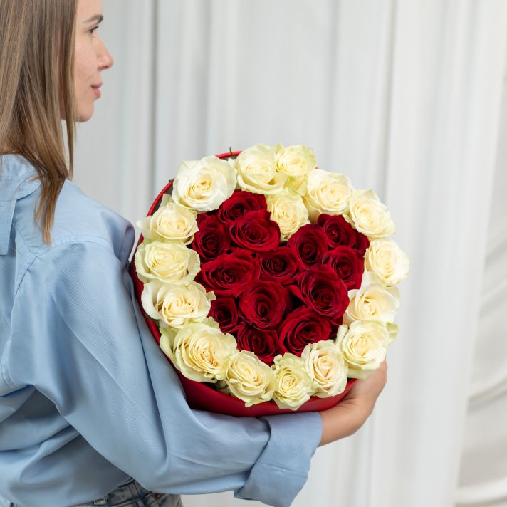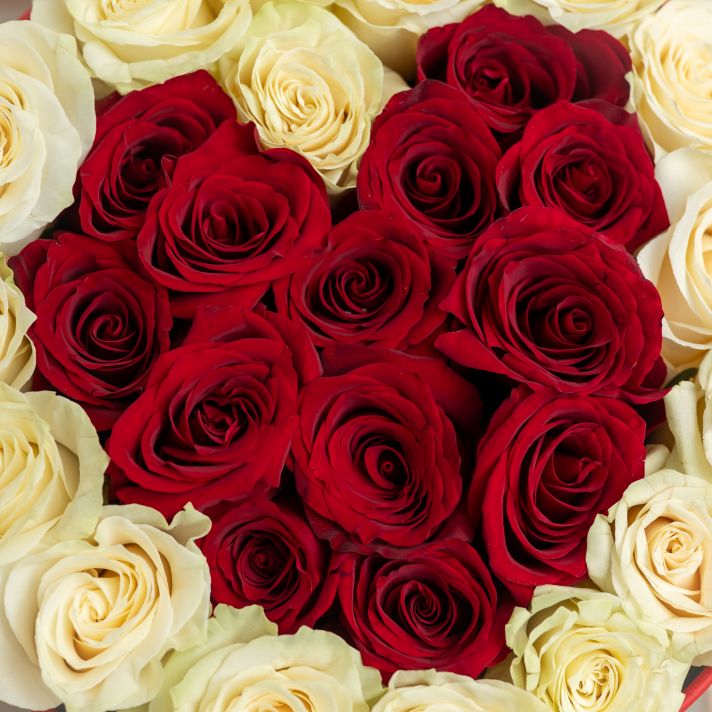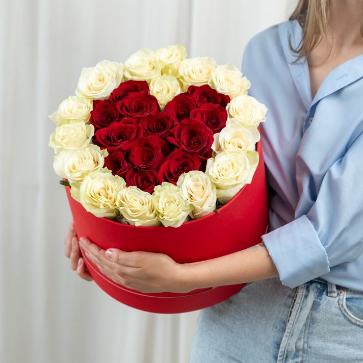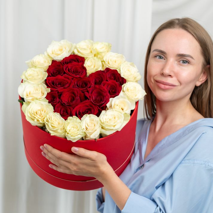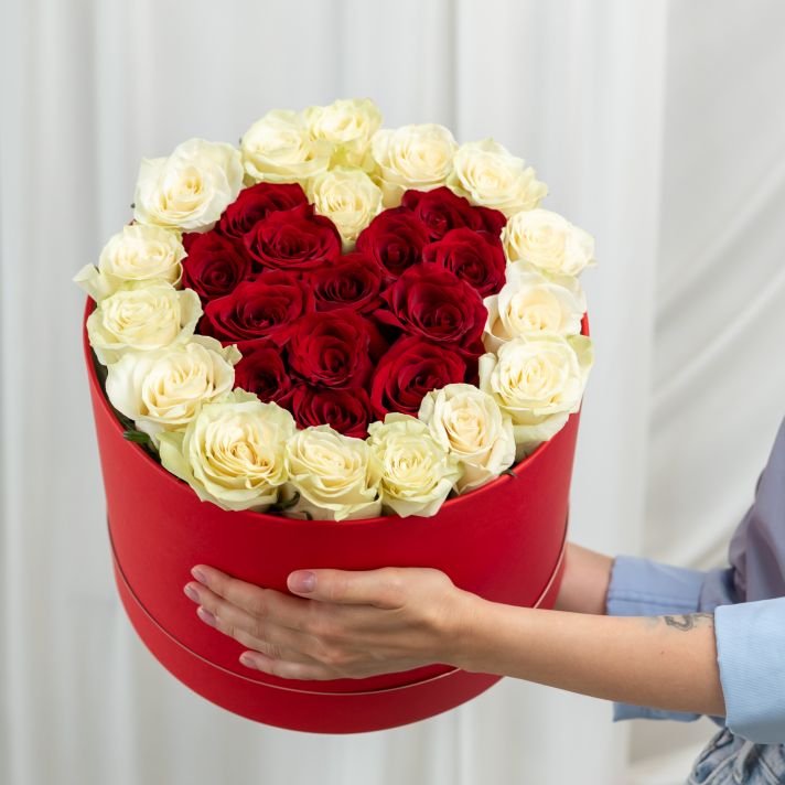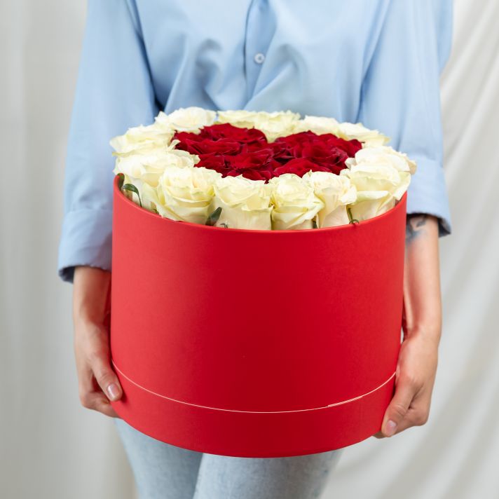 В составе красные розы (16 шт), белая роза (17 шт), шляпная коробка, флористическая губка.