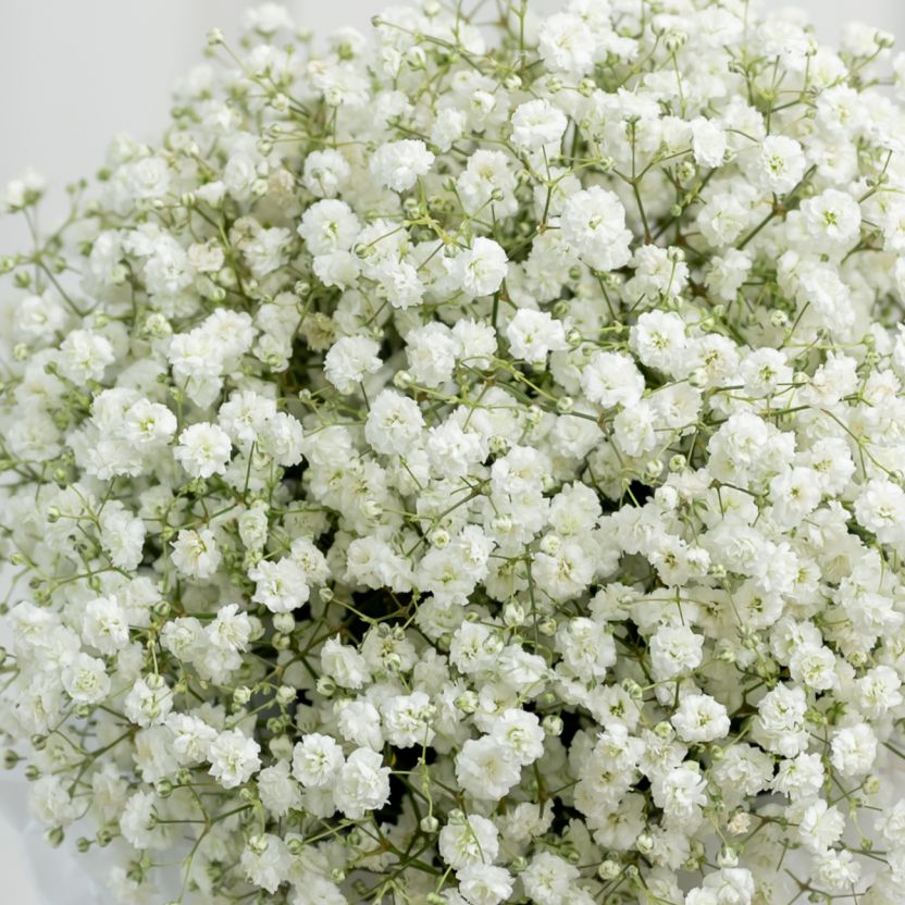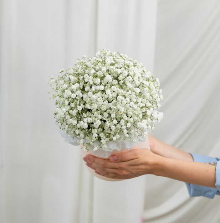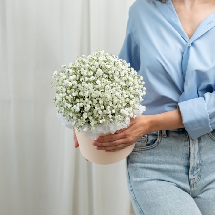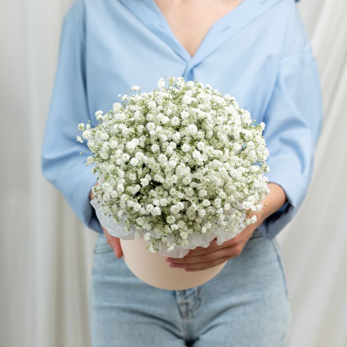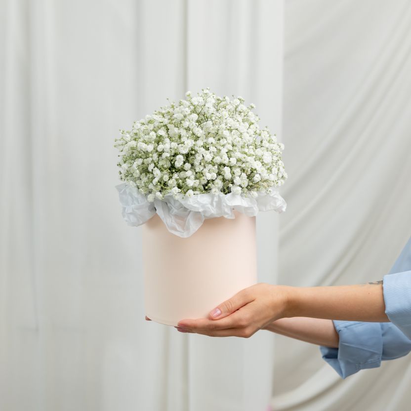 В составе гипсофила белая (5 шт), шляпная коробка, флористическая губка.