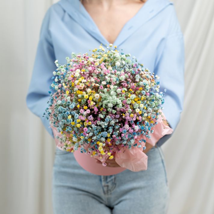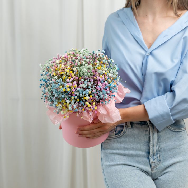 В составе гипсофила радужная (5шт), шляпная коробка, флористическая губка.