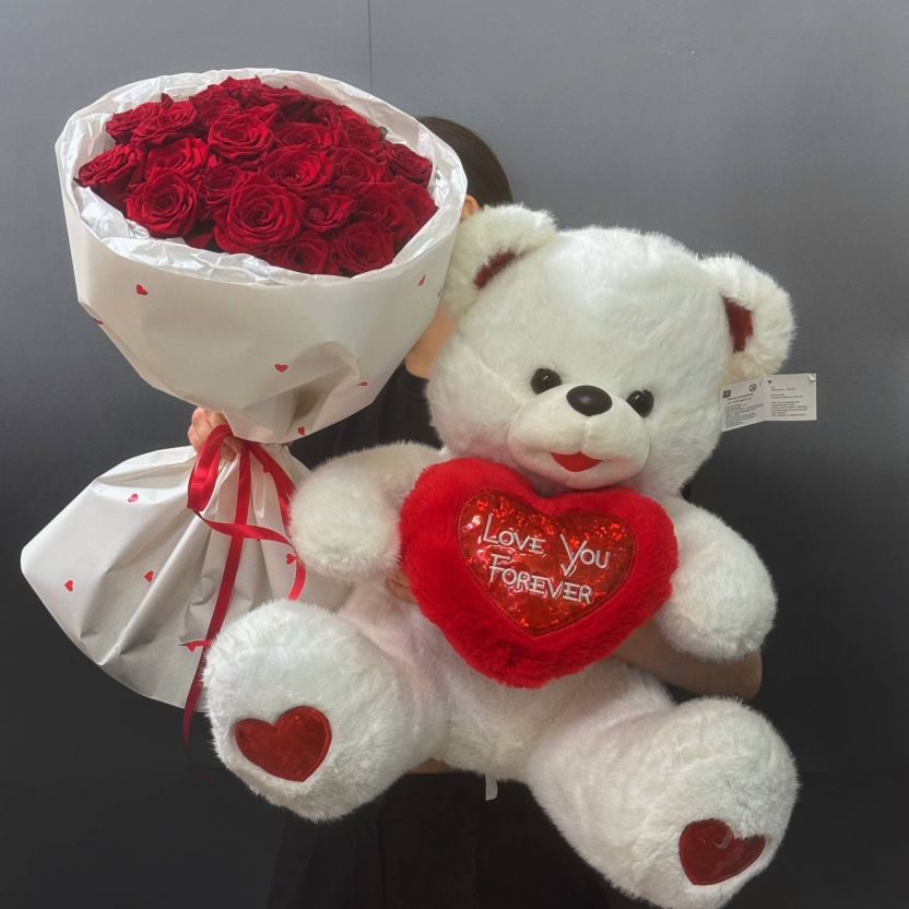 Набор 25 красных роз с Большим Медведем