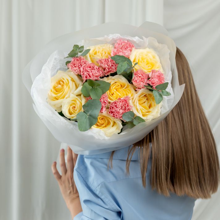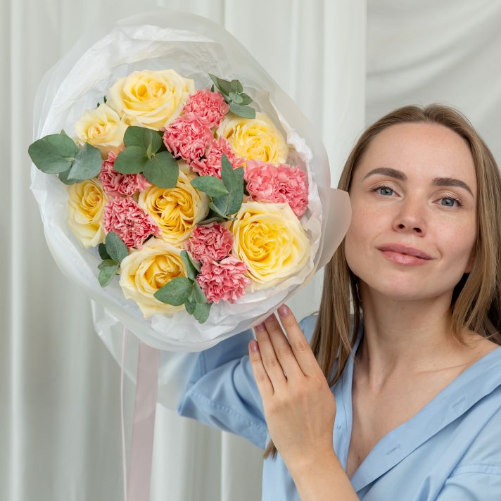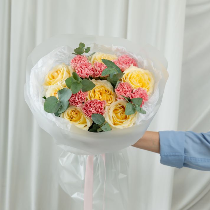 В составе роза (сорт Кендл Лайт) 7 шт, диантус 9 шт, эвкалипт 2 шт, упаковка дизайнерская.