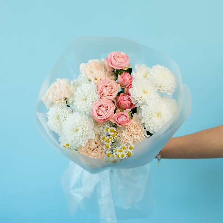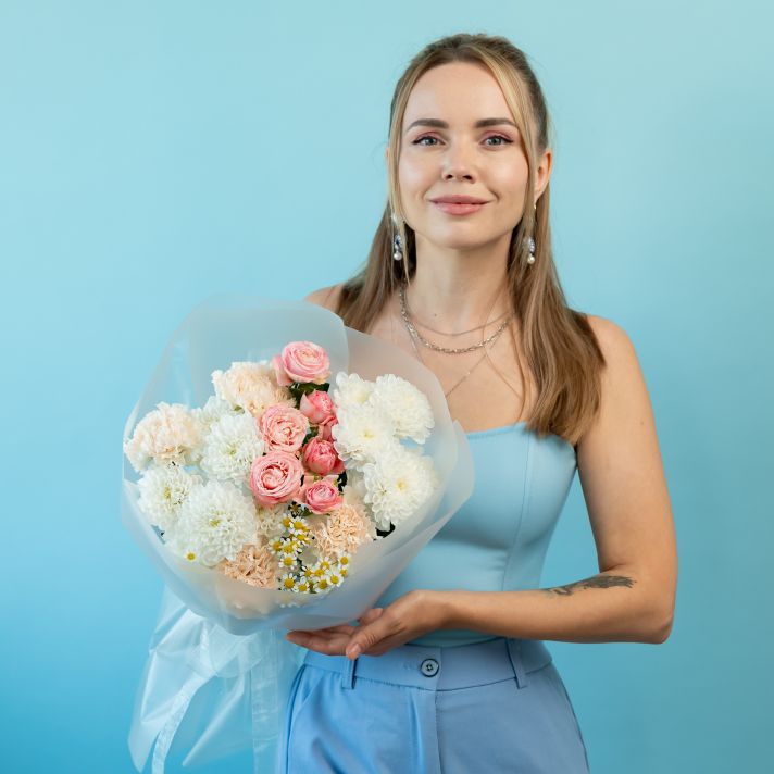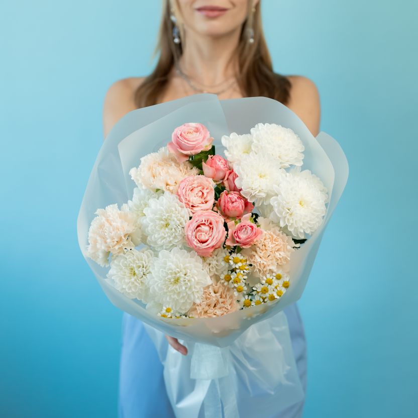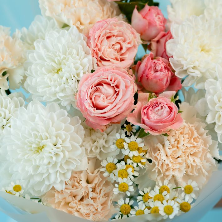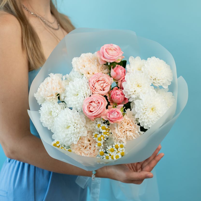 Сборный букет из кустовых роз, хризантем и ромашек