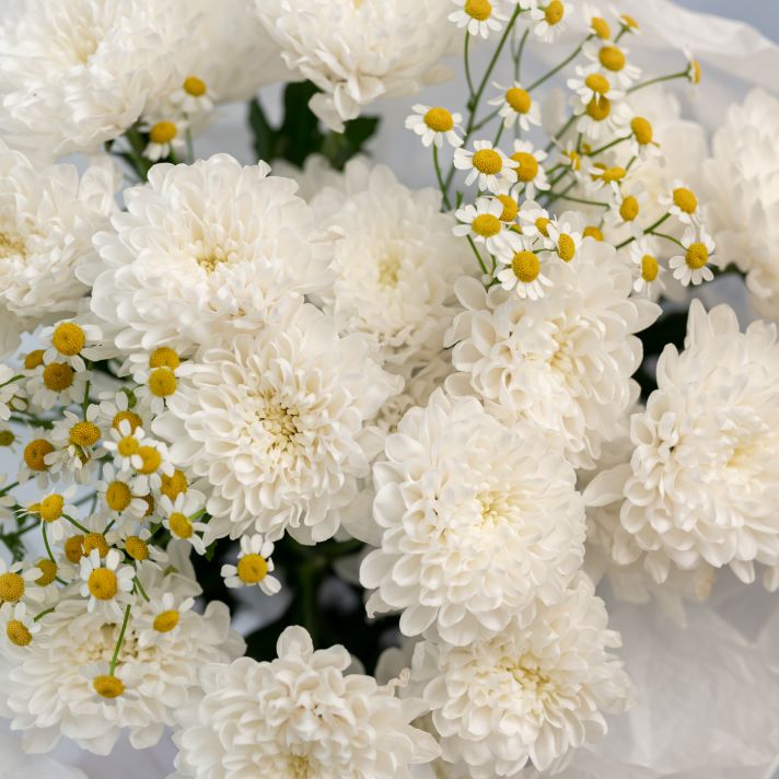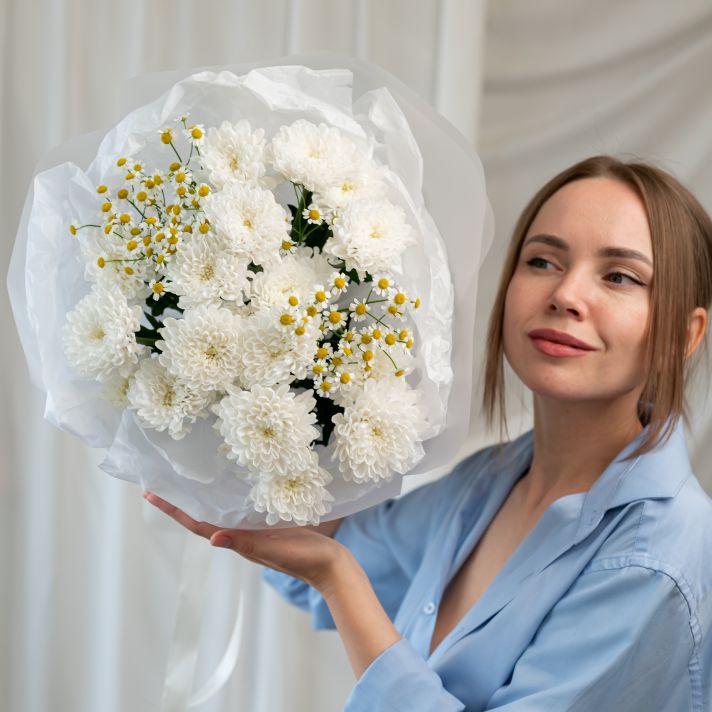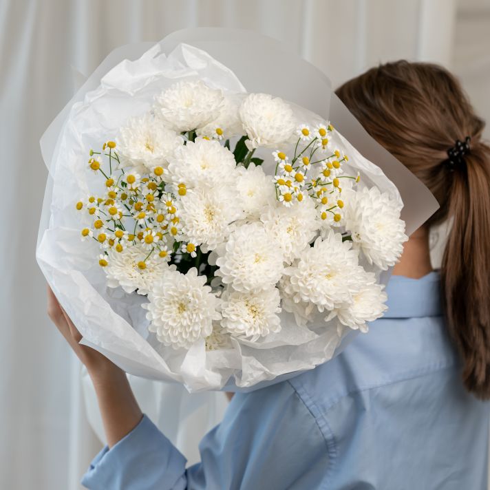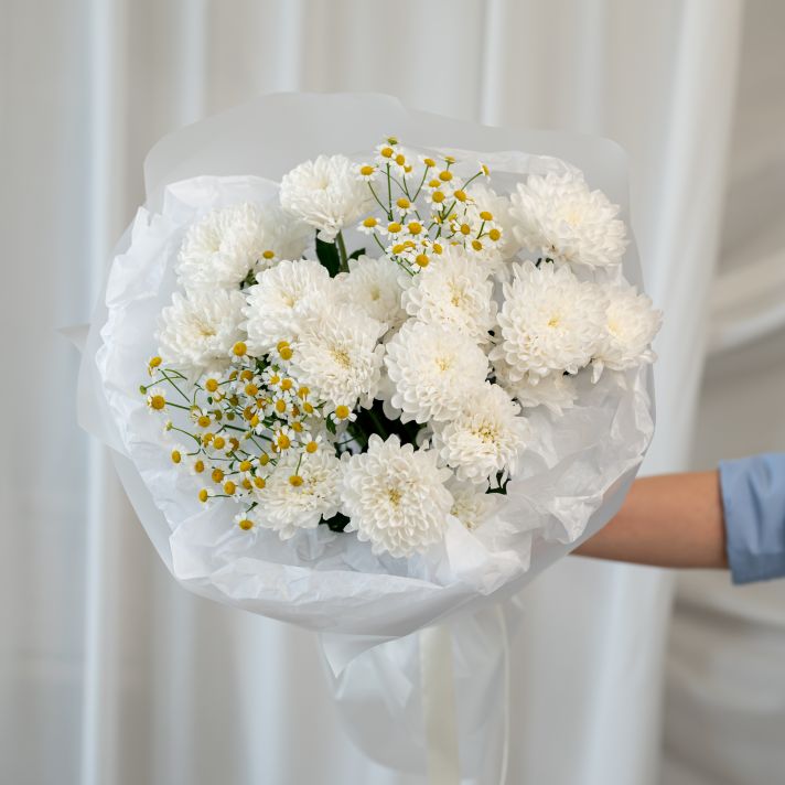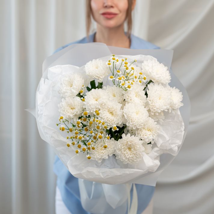 В составе хризантема кустовая (сорт Алтай) 3 шт, матрикария 2 шт, упаковка дизайнерская.