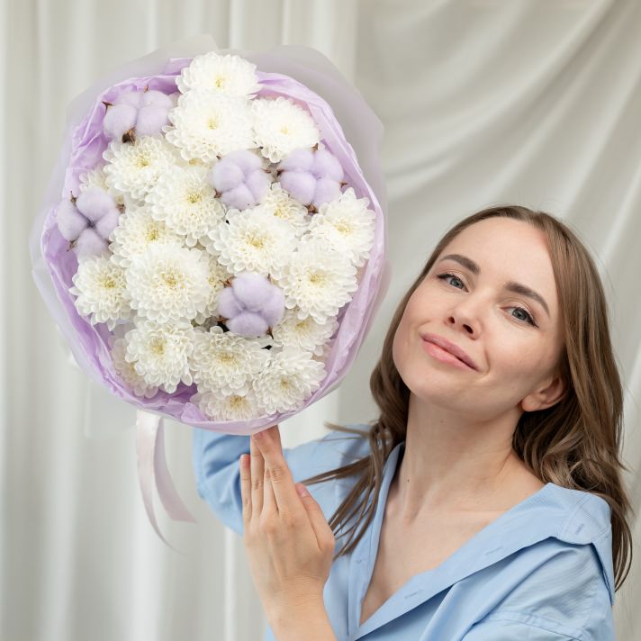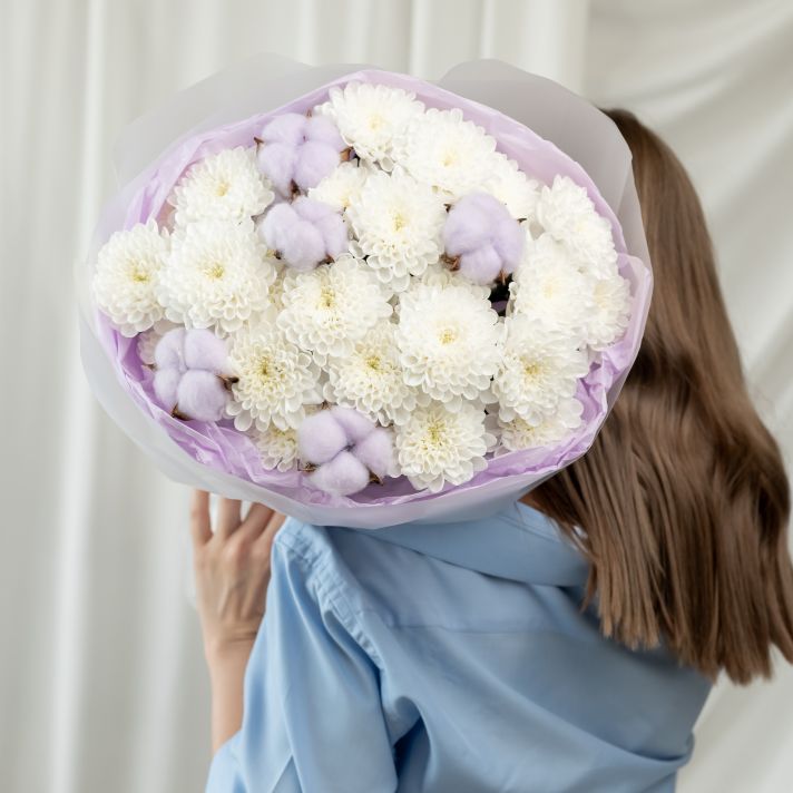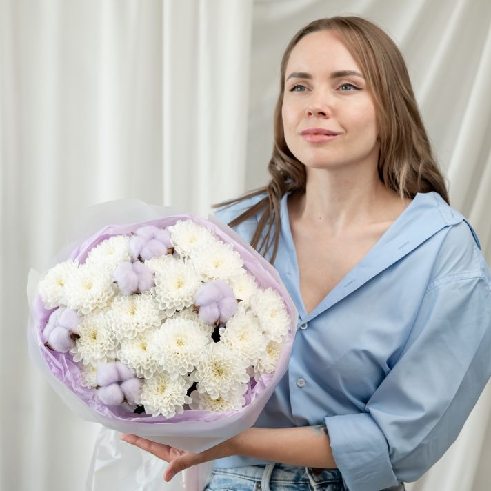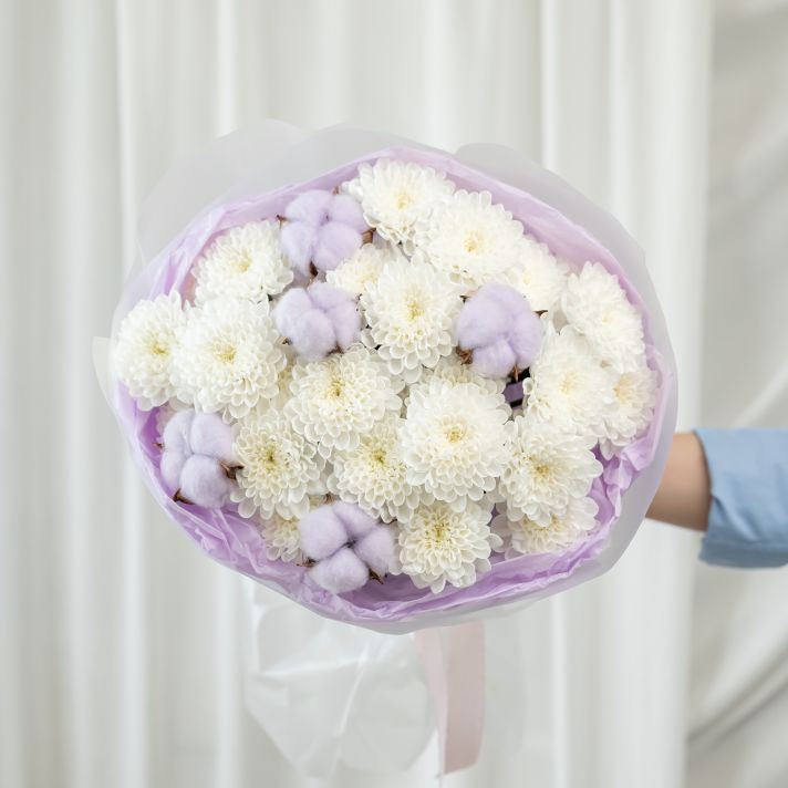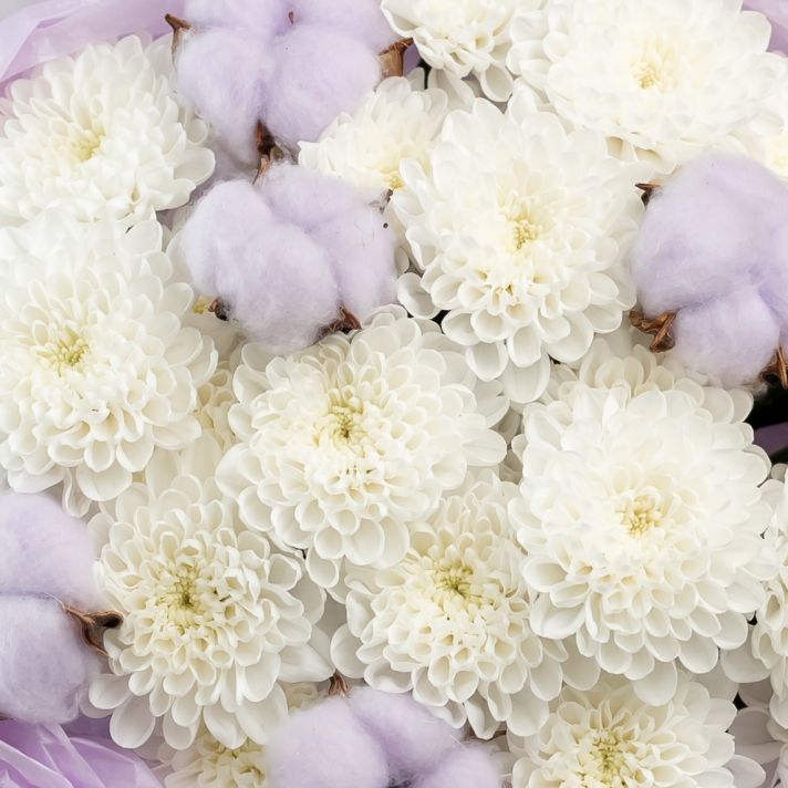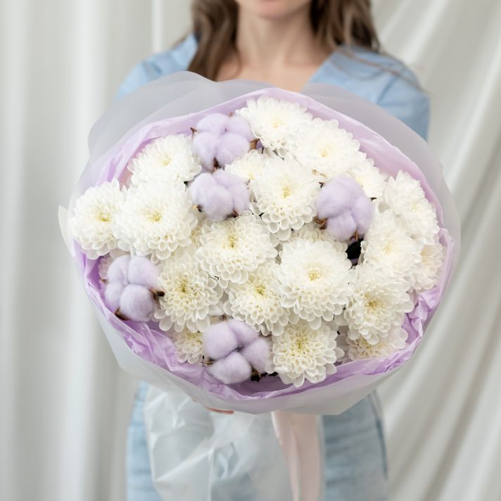 В составе хризантема кустовая (сорт Алтай) 5 шт, хлопок крашенный 5 шт, упаковка дизайнерская.