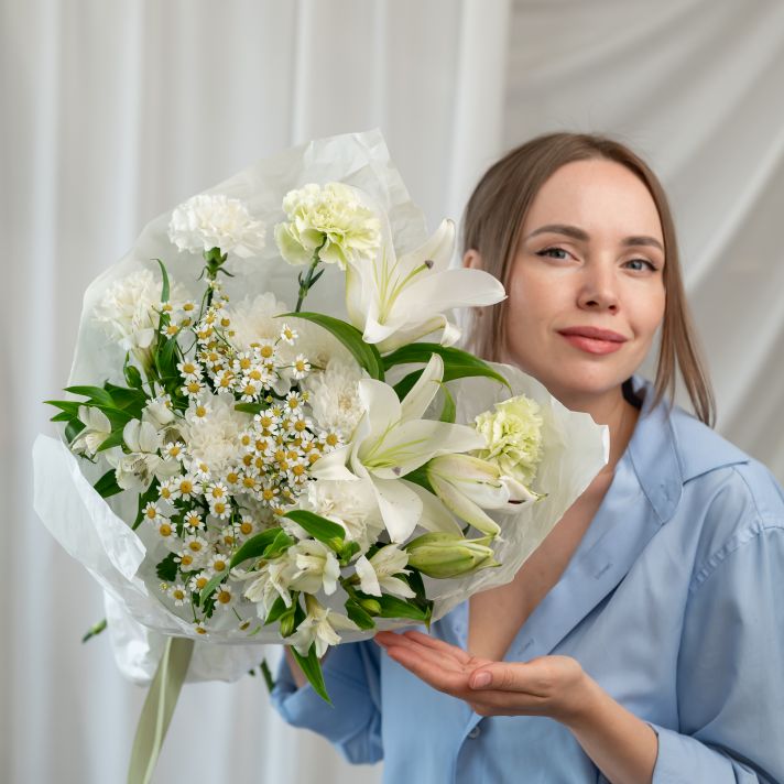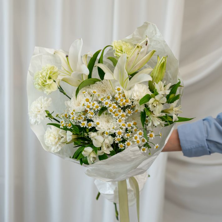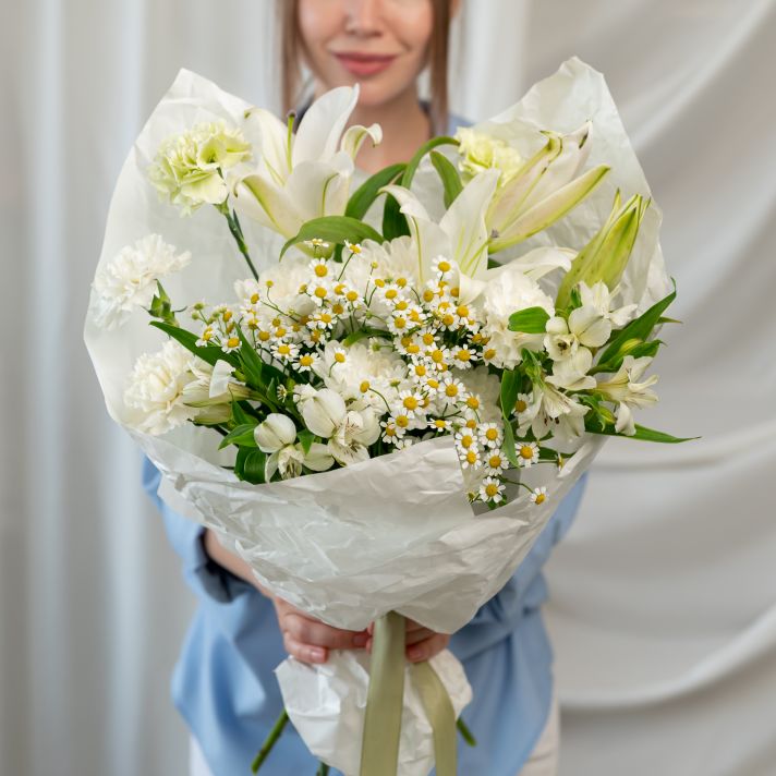 В составе лилия 1 шт, матрикария 2 шт, альстромерия 2 шт, диантус 5 шт, хризантема кустовая (сорт Алтай) 2 шт, упаковка дизайнерская.