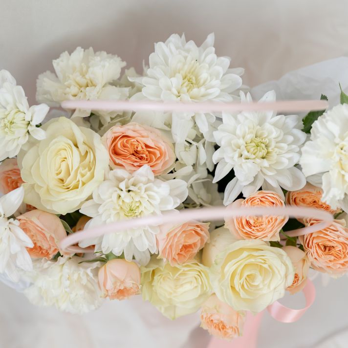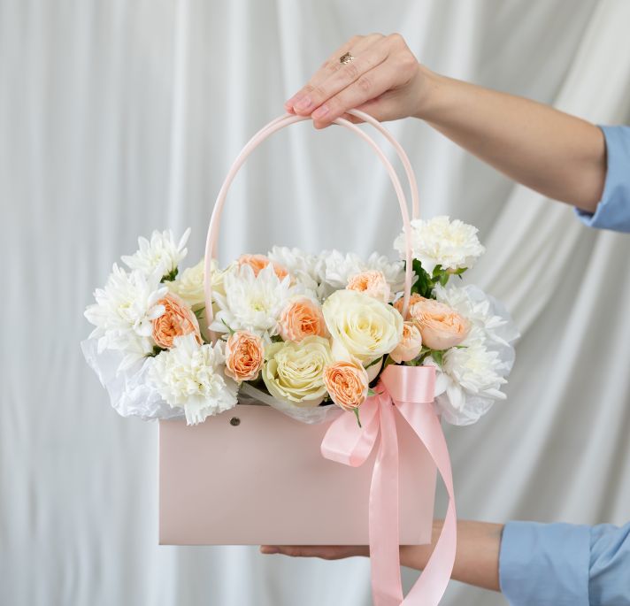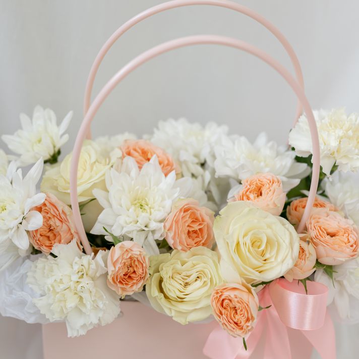 В составе хризантема кустовая (сорт Алтай) 2 шт, кустовая роза 2 шт, диантус 3 шт, роза одноголвая 3 шт, сумочка 1 шт, флористическая губка 1 шт.